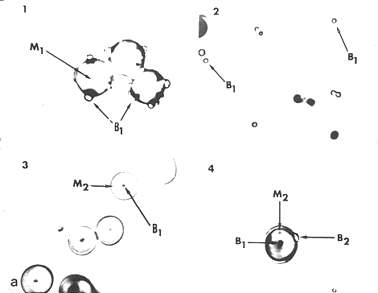 ![]() Sobald eine Mikrosphäre (M1) eine bestimmte Größe erreicht hat (1), bildet sie Knospen (B1), die sich abgliedern. (2). Jede von ihnen ist Ausgangspunkt der Bildung einer neuen Mikrosphärengeneration (M2) (3), die sich ihrerseits wieder durch Knospung reproduziert (4). b Elektronenmikroskopische Aufnahme eines Querschnitts durch eine knospende Mikrosphäre. Man beachte die Doppelschicht (durch Self-assembly aus Proteinoiden aufgebaut) der "Mikrosphärenmembran". Die Dimensionen dieser Doppelschicht stimmen nicht mit denen einer Phospholipid-Doppelschicht in zellulären Membranen überein. |